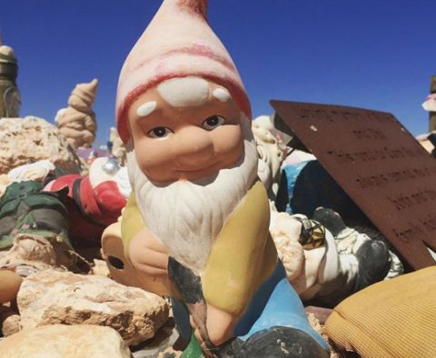 After leaving Carnarvon and traveling south, you’ll come to the Gladstone Scenic Lookout. It has become a graveyard for garden gnomes that people have taken with them on their travels. People get fed up with them and retire them here along with memorials hand written onto rocks. If you like wide open spaces, you’ll get that here. It is an expanse of sky and barren plains.